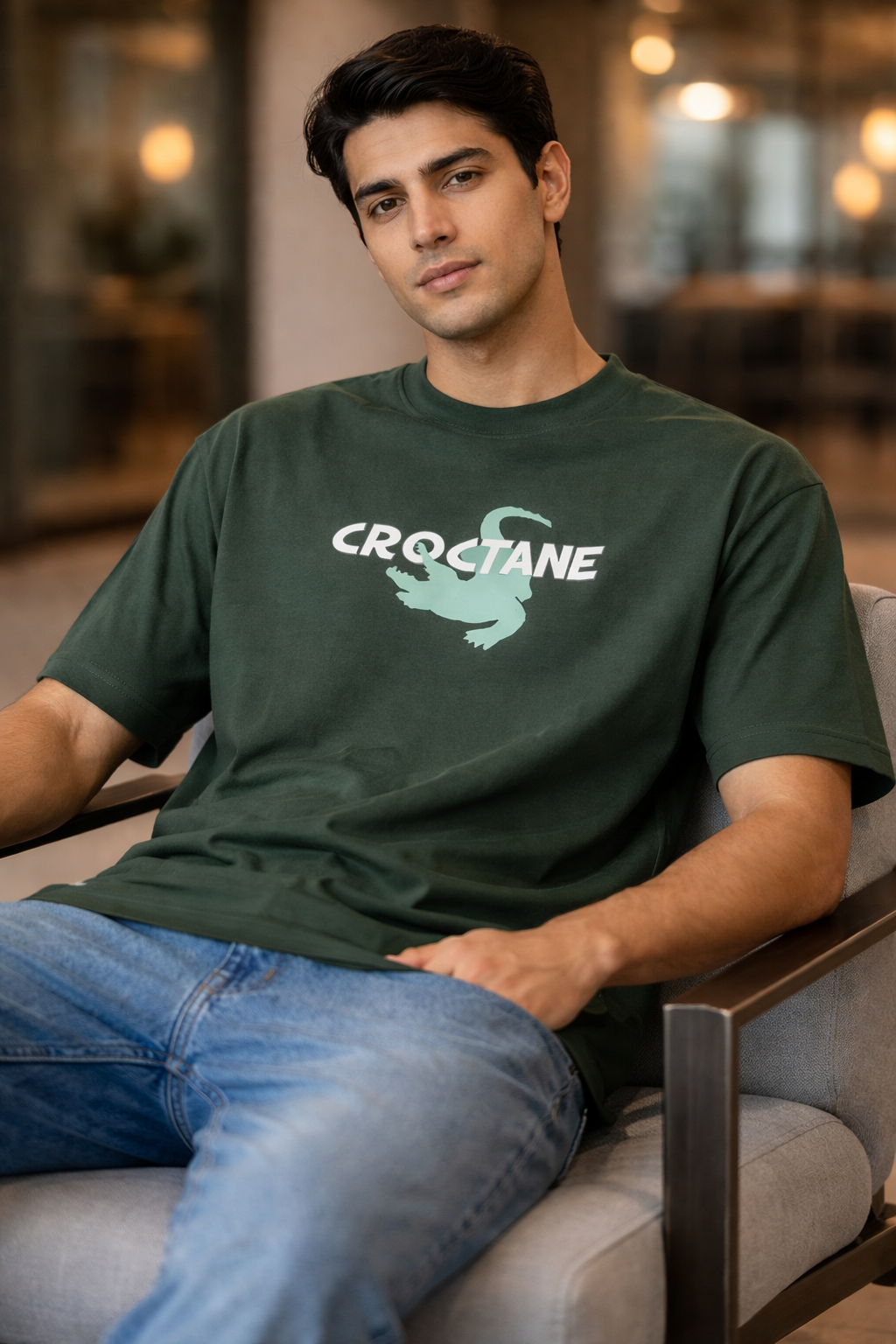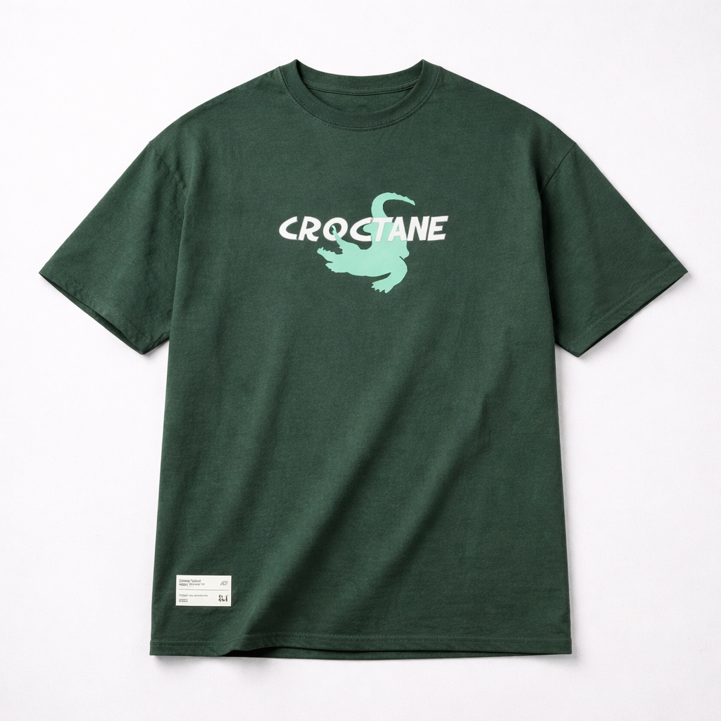 A trendy green t-shirt featuring a bold βCrocTaneβ graphic with a crocodile design for a sporty and modern look.