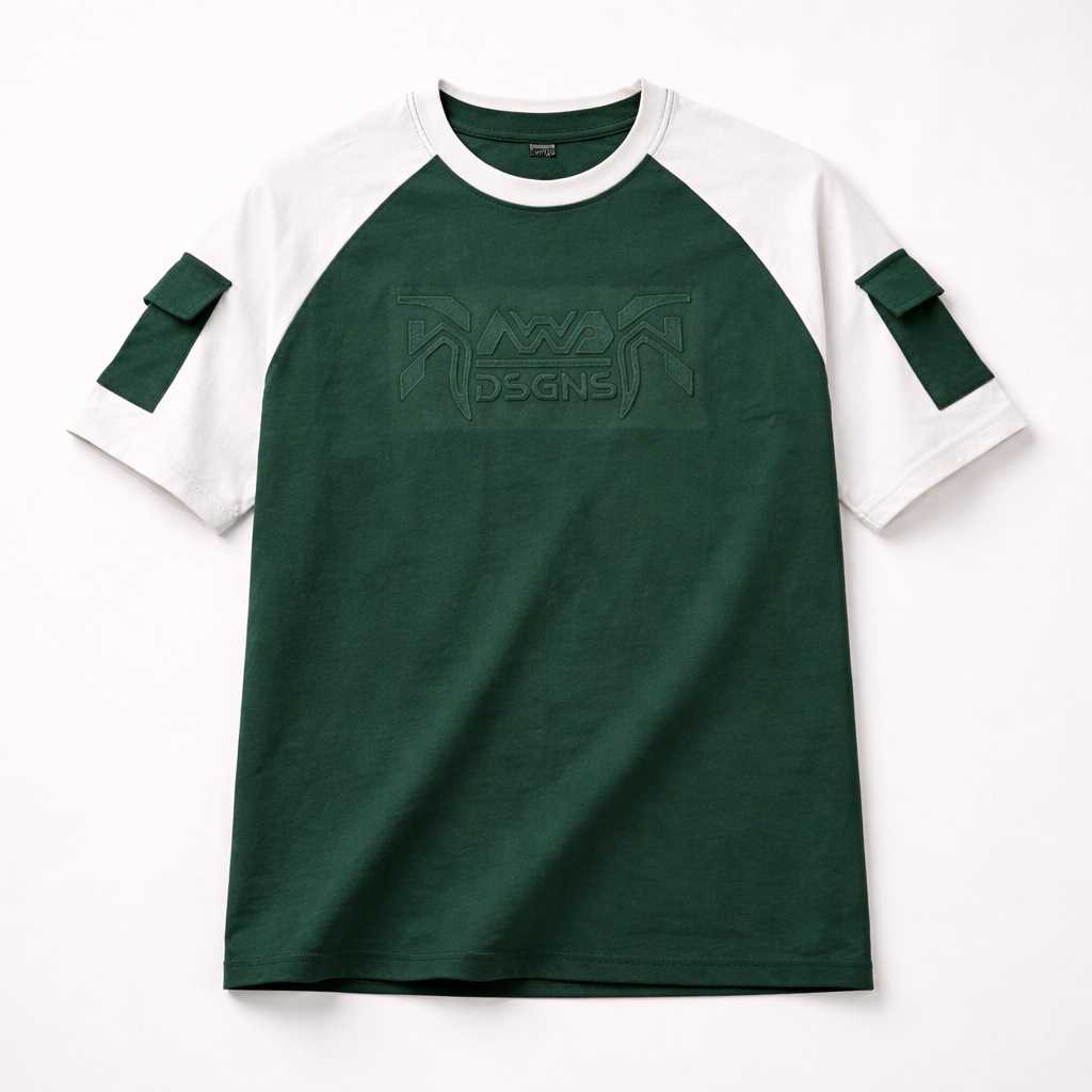A bold forest green raglan t-shirt with white contrast sleeves and utility pockets, designed for a stylish and modern streetwear look.