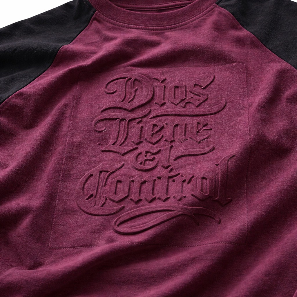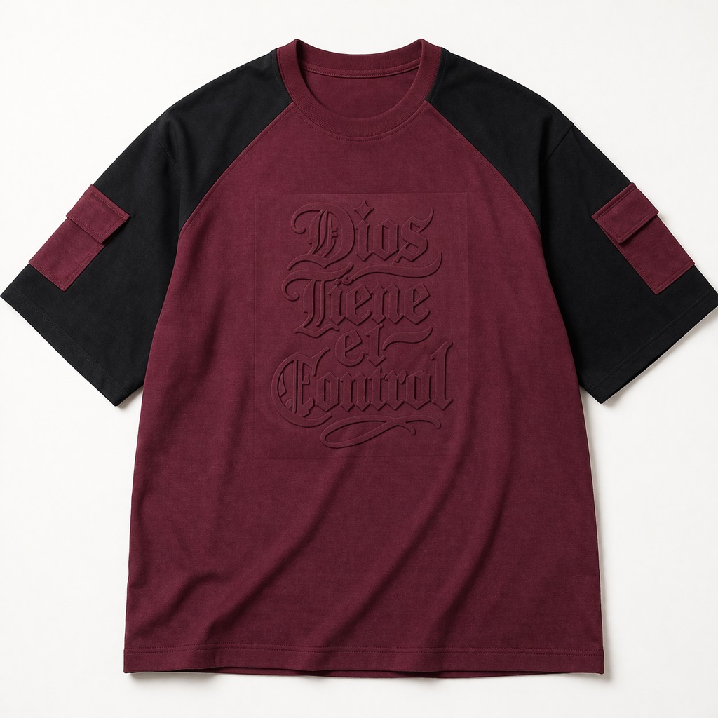 Crafted from 100% pure cotton, this t-shirt offers ultimate breathability and comfort for all-day wear. The design features a modern maroon and black raglan style with unique cargo-flap pockets on the sleeves. The center is detailed with a high-density embossed “Dios Tiene El Control” graphic, adding a premium texture and depth. Its relaxed fit makes it a perfect choice for those seeking a balance between high-street fashion and everyday comfort.
