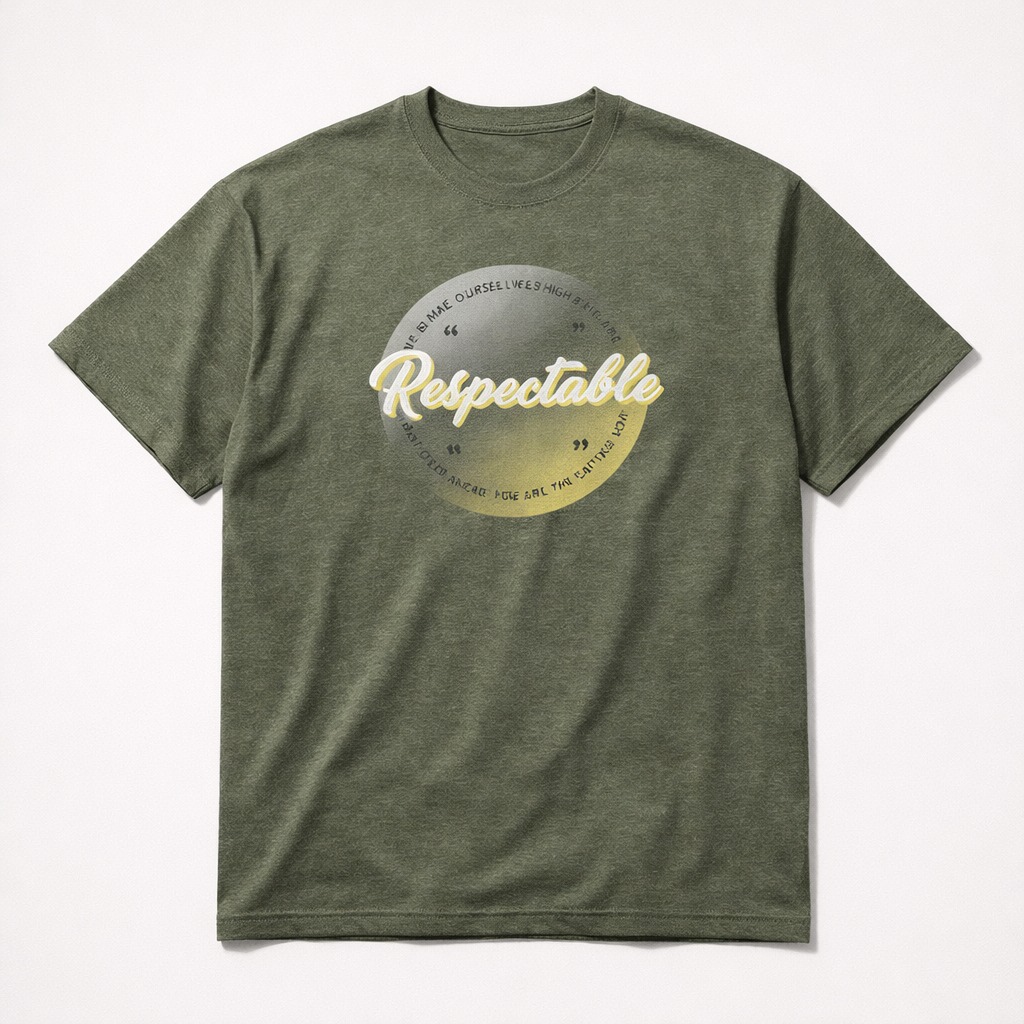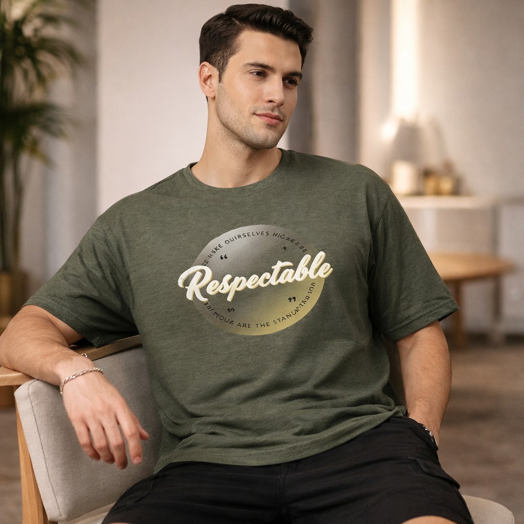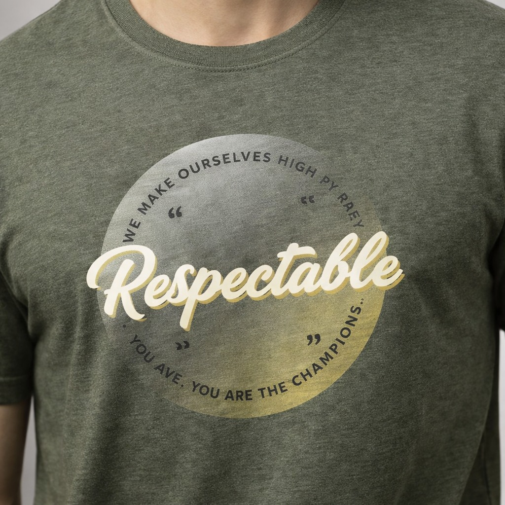 A comfortable olive green t-shirt made from 100% pure cotton, featuring a stylish “Respectable” circular graphic print on the chest.
