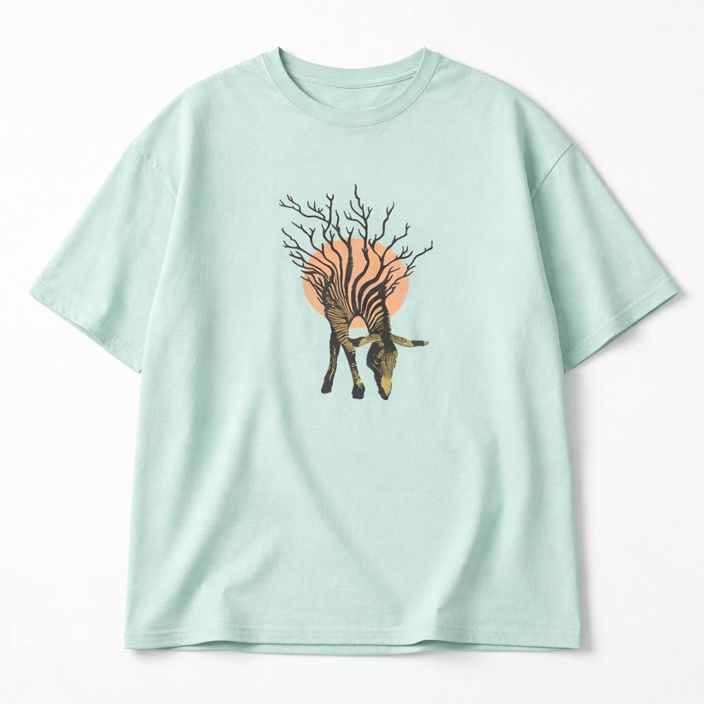 This men’s t-shirt is made from 100% premium cotton, offering a lightweight and breathable feel for maximum comfort. The chest features a creative graphic of a zebra with branch-like patterns set against a soft orange sun, giving it an artistic and modern look. Designed with a classic crew neck and a regular fit, this sea green tee is perfect for adding a pop of color and style to your casual everyday wardrobe.