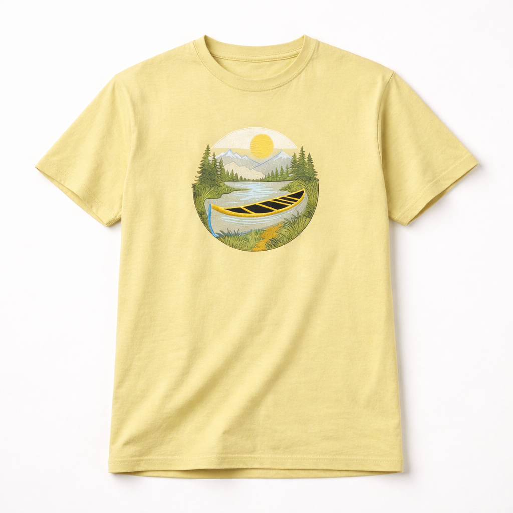 A refreshing light green t-shirt featuring a scenic nature graphic with a boat and landscape design, perfect for a calm and stylish everyday look.