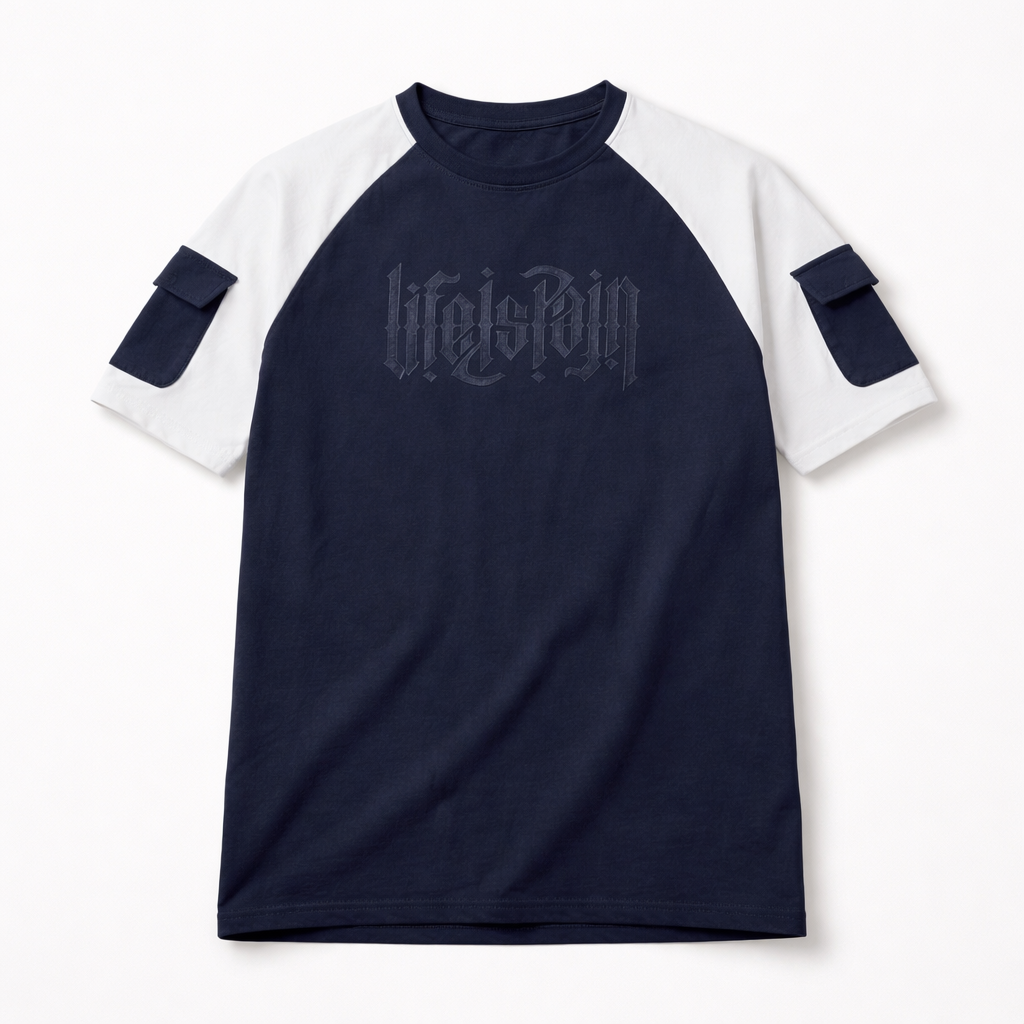 A stylish navy blue raglan t-shirt with white contrast sleeves and utility pockets, perfect for a bold and modern casual look.