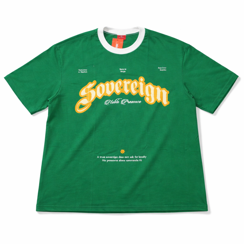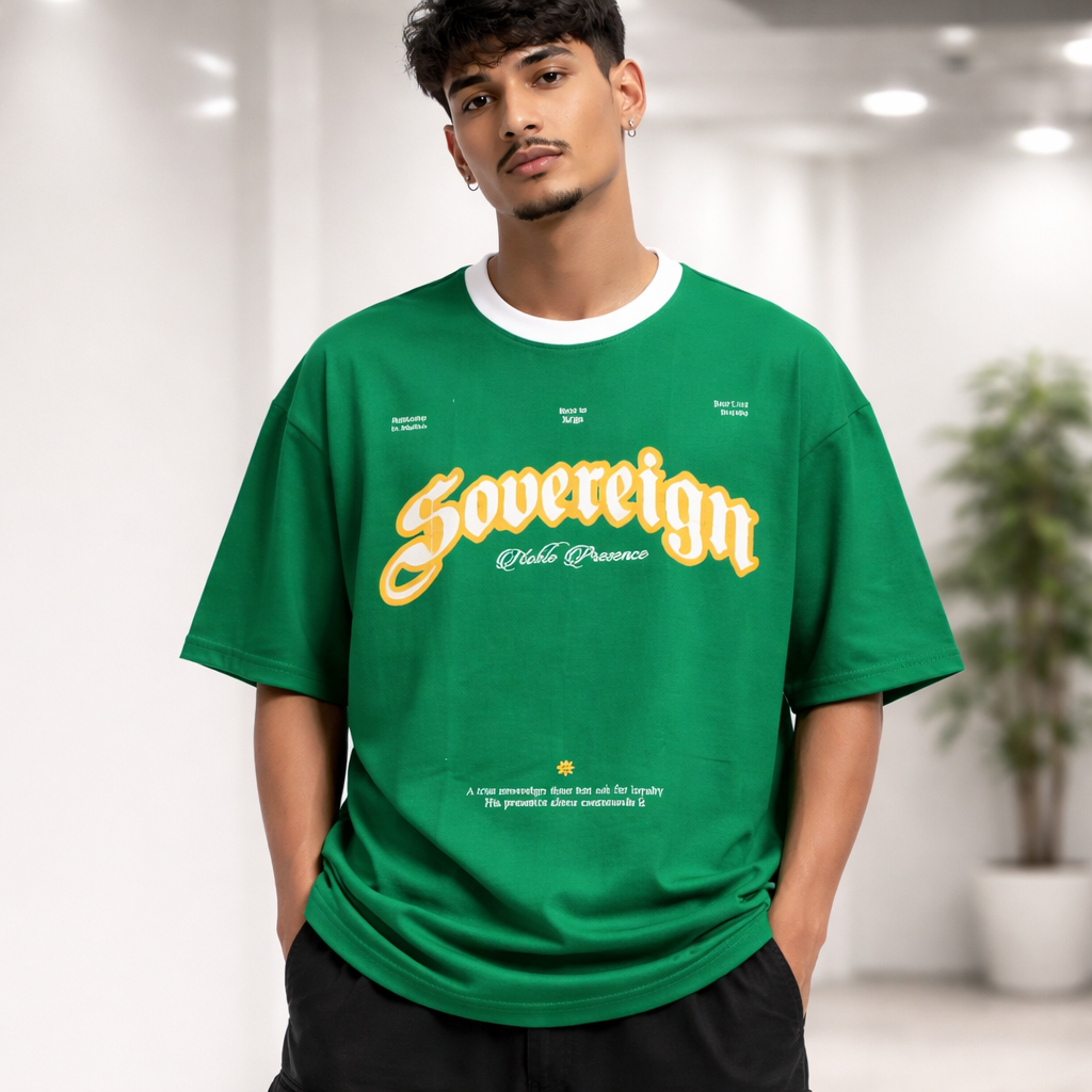 Aa Sovereign “Noble Presence” T-Shirt sathe ek bold statement ubhu karo. Aa oversized tee ma sophisticated typography, contrast ribbed collar, ane pre-shrunk premium fabric chhe, je tamne aakho divas stylish ane comfortable rakhshe.