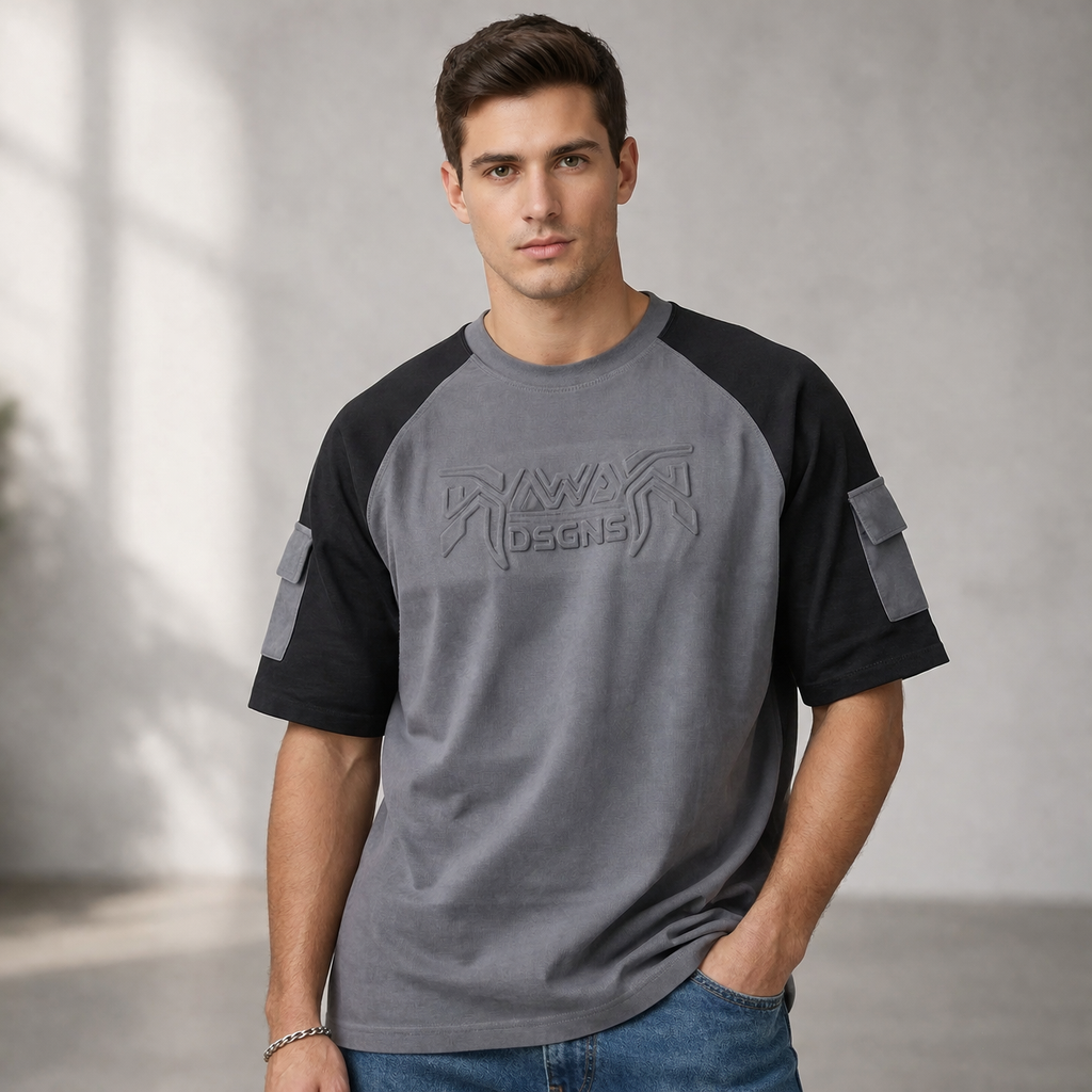 The standout feature of this t-shirt is its utility-inspired sleeve pockets, adding a functional and edgy touch to the overall design. The embossed front graphic enhances the premium feel without being overly flashy, making it perfect for both casual and semi-streetwear outfits.