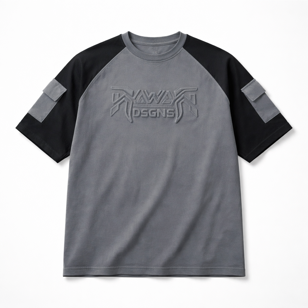A sleek grey raglan t-shirt with black contrast sleeves and utility-style pockets, offering a bold and modern streetwear vibe.
